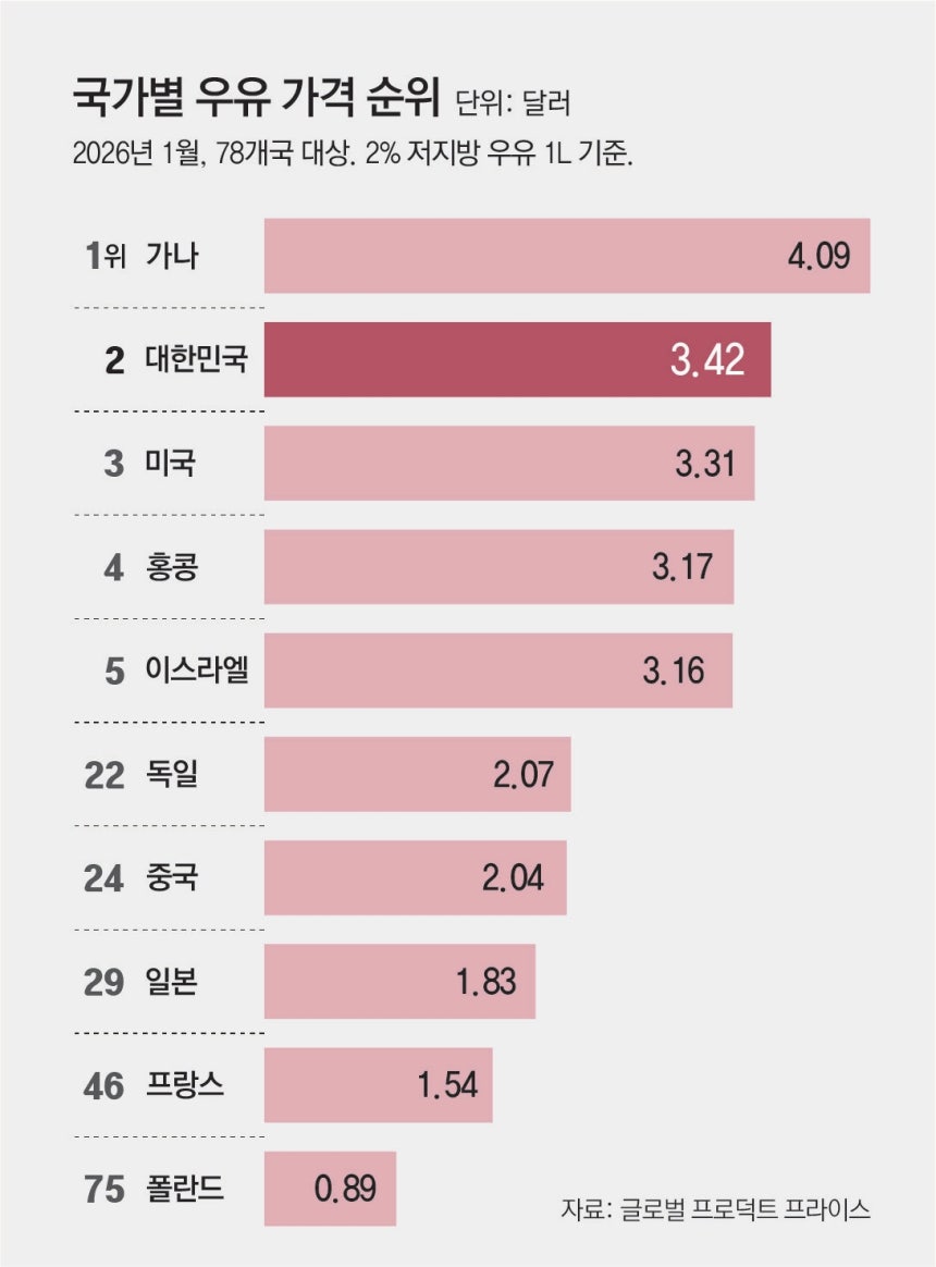 흰 우유 수요 감소의 다른 원인으로는 세계 최고 수준의 가격도 꼽힌다.국제 물가 비교 사이트‘글로벌 프로덕트 프라이스’에 따르면 1월 기준 한국의 우유 가격(1.5∼2.5% 저지방·1L)은 3.42달러(약 5150원)로 집계됐다.조사 대상 78개국 가운데 가나에 이어 두 번째로 높았다.중국(2.04달러),일본(1.83달러)과 비교하면 한국 우유 가격은 1.7∼1.9배가량 비싼 수준이다.멸균 우유의 주요 산지인 유럽권과의 격차는 더 크다‘믈레코비타’등 멸균 우유 브랜드로 익숙한 폴란드(0.89달러)와 비교하면 국내 우유는 3.8배 더 비싼 것으로 나타났다.