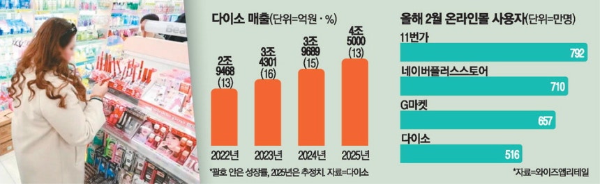5000원 이하 균일가 생활용품 전문점으로 매출 5조원을 목전에 두고 있는 다이소가 온라인몰에서도 빠른 성장세를 보이고 있다.고물가와 불황 장기화 속에서 가성비 소비 트렌드를 주도하는 핵심 채널로 안착한 게 배경이다.1000원짜리 주방용품 등 생활 잡화를 팔던 곳이었지만 지난 2~3년간은 뷰티,건강기능식품,경마이기는법패션까지 다른 영역으로도 전방위로 확장하며 매출을 끌어올리고 있다.특히 최근에는 자사몰 앱도 월간 사용자가 500만명을 넘어서며 온라인 전문몰을 위협하고 있다.